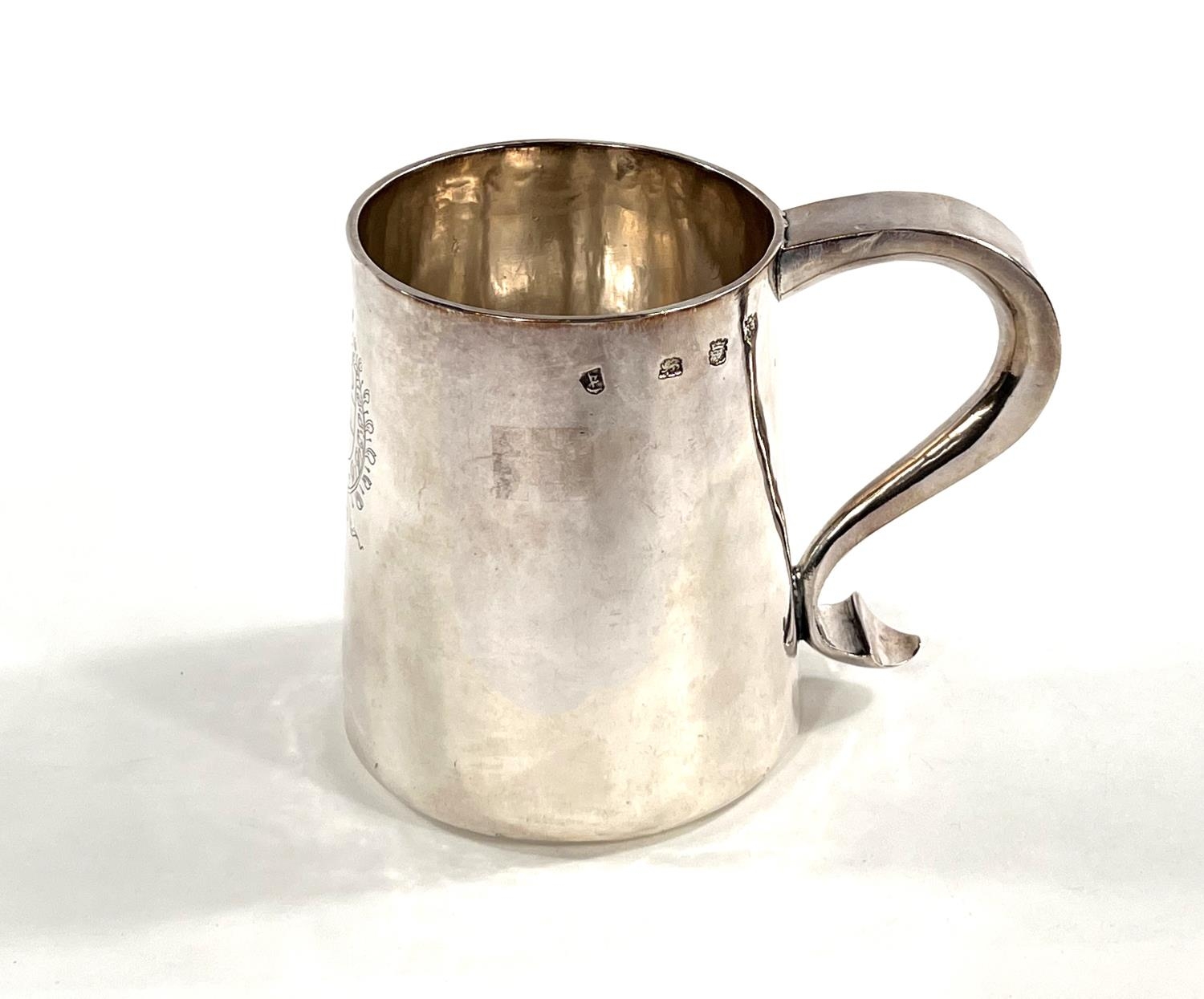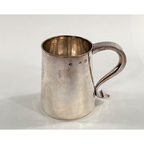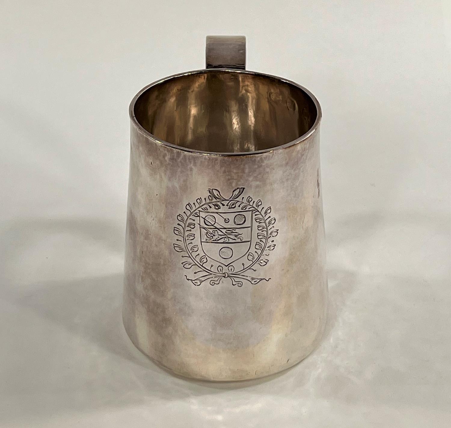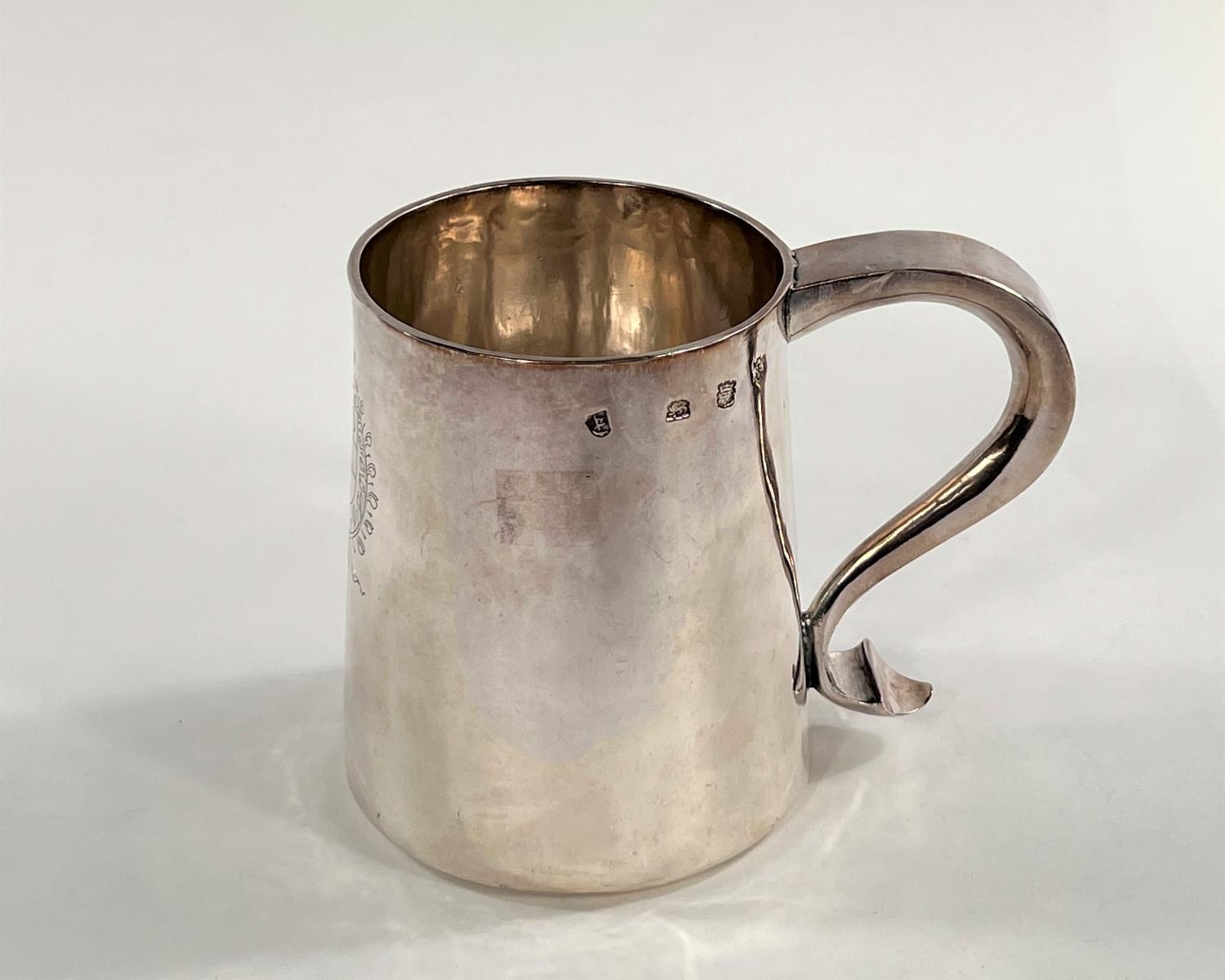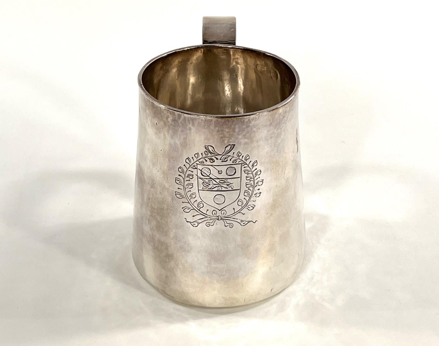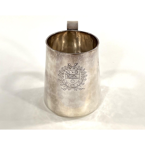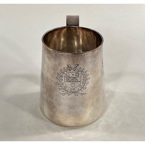 A Charles I hallmarked silver mug of tapering cylindrical form with engraved Coat of Arms, London 1642, the base monogrammed "H A I", and with scratch weight "14-12-0", 10.5oz/335gm, maker R S (some repairs; possibly had lid originally)