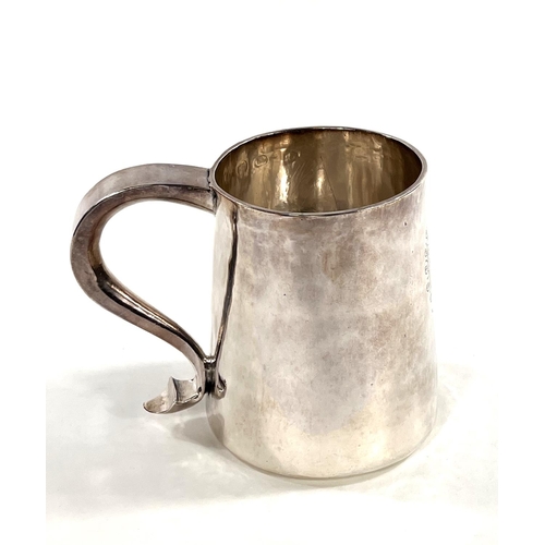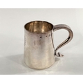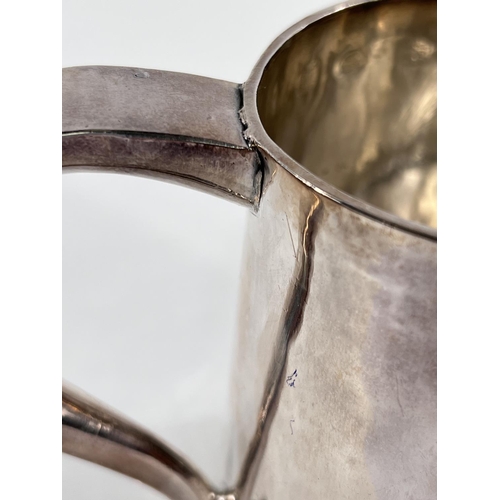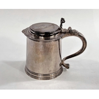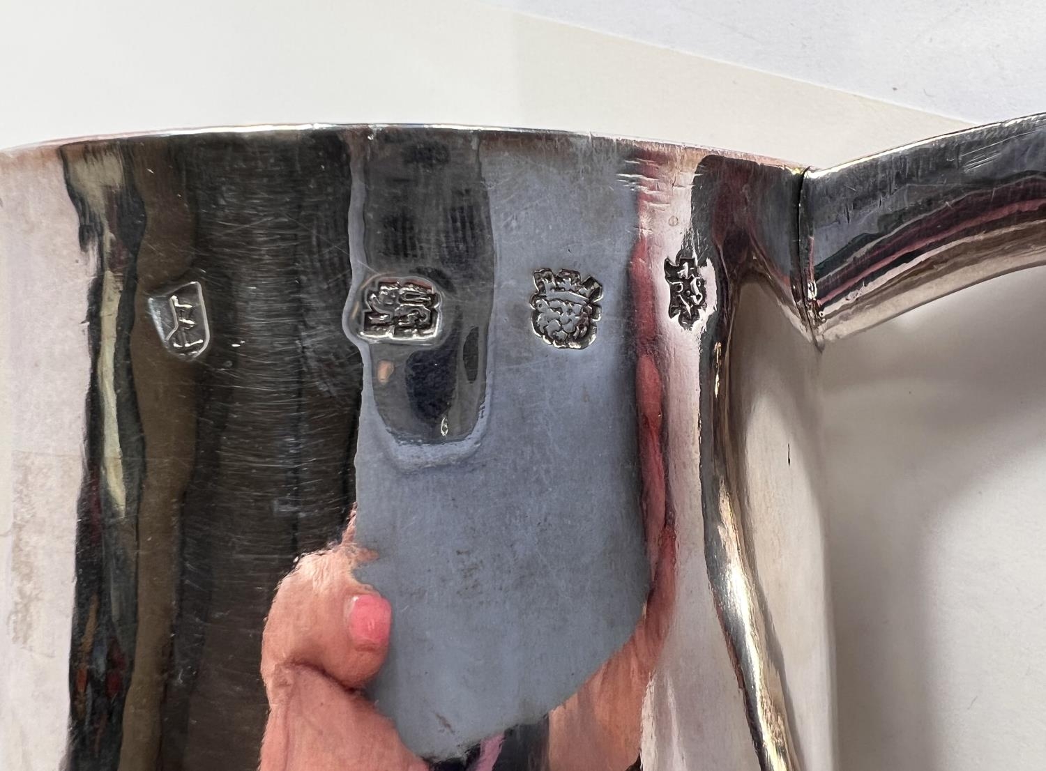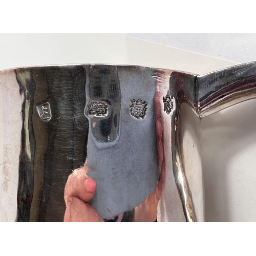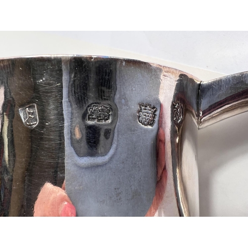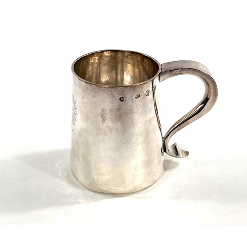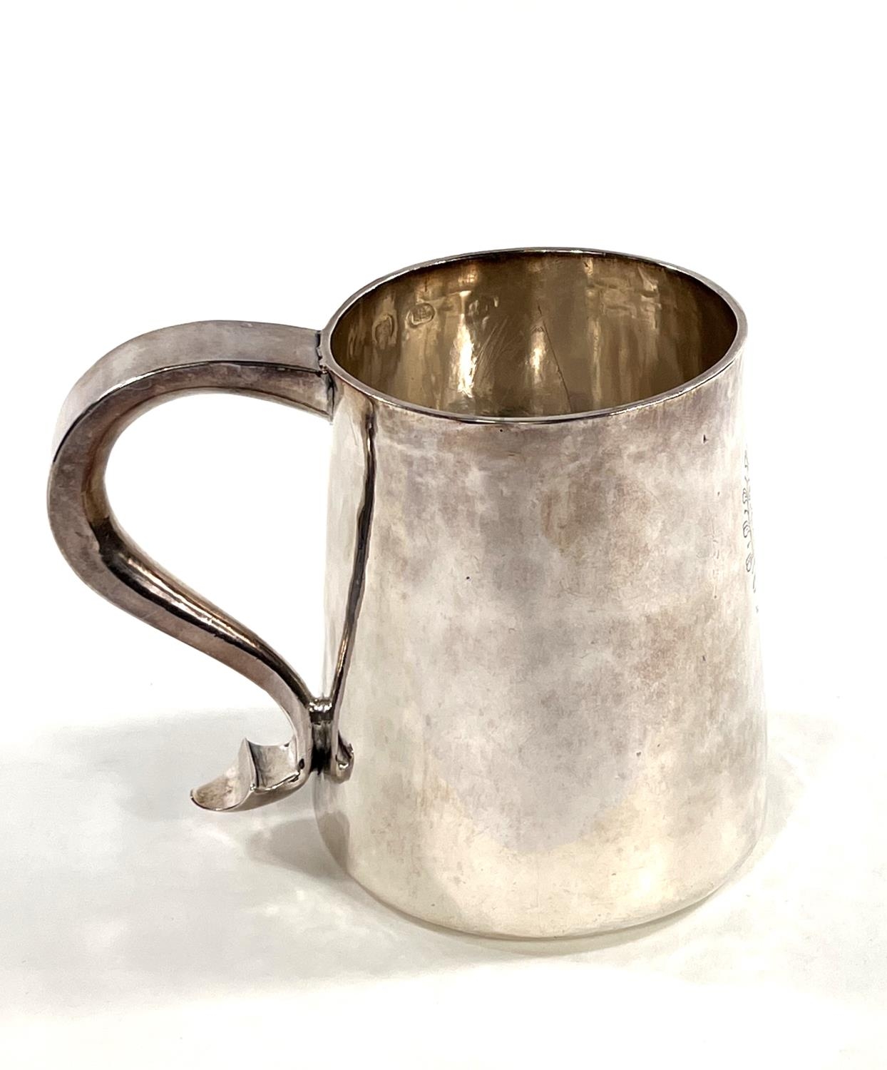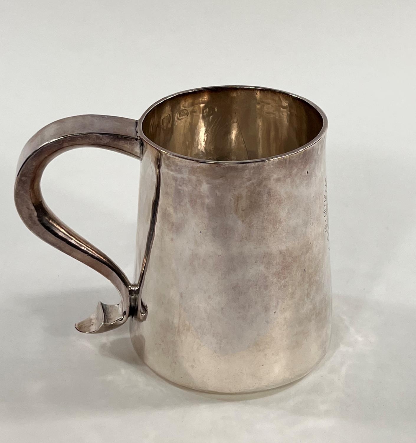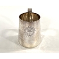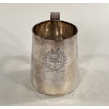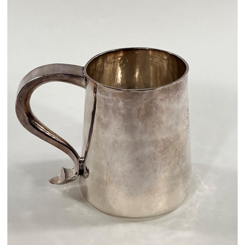 A Charles I hallmarked silver mug of tapering cylindrical form with engraved Coat of Arms, London 1642, the base monogrammed "H A I", and with scratch weight "14-12-0", 10.5oz/335gm, maker R S (some repairs; possibly had lid originally)