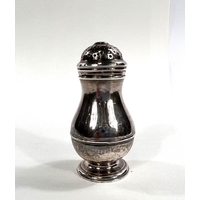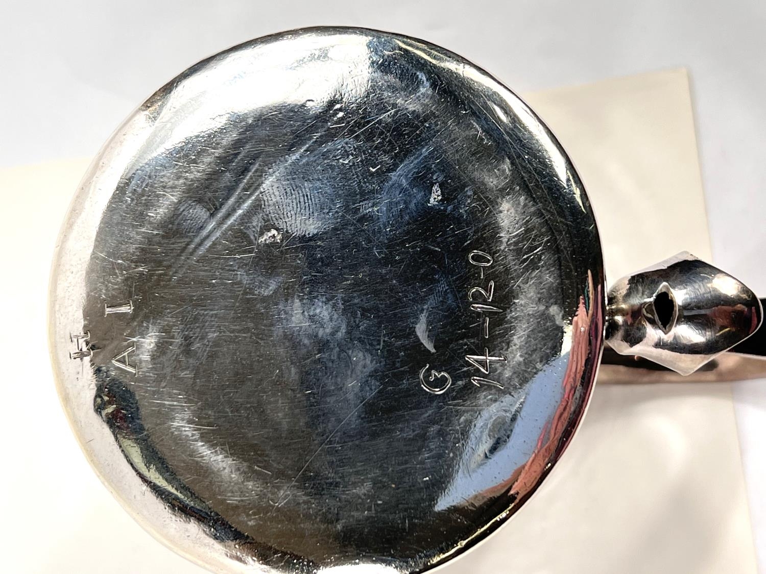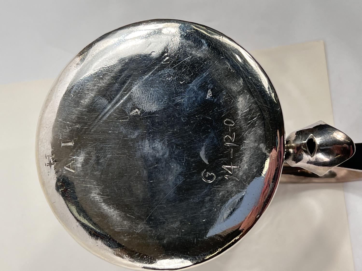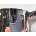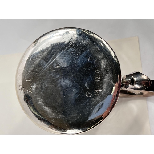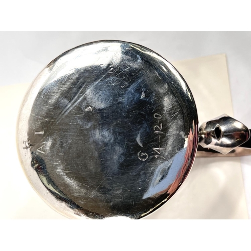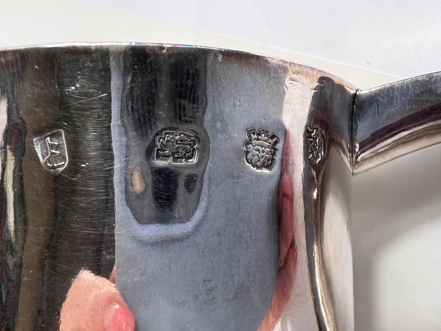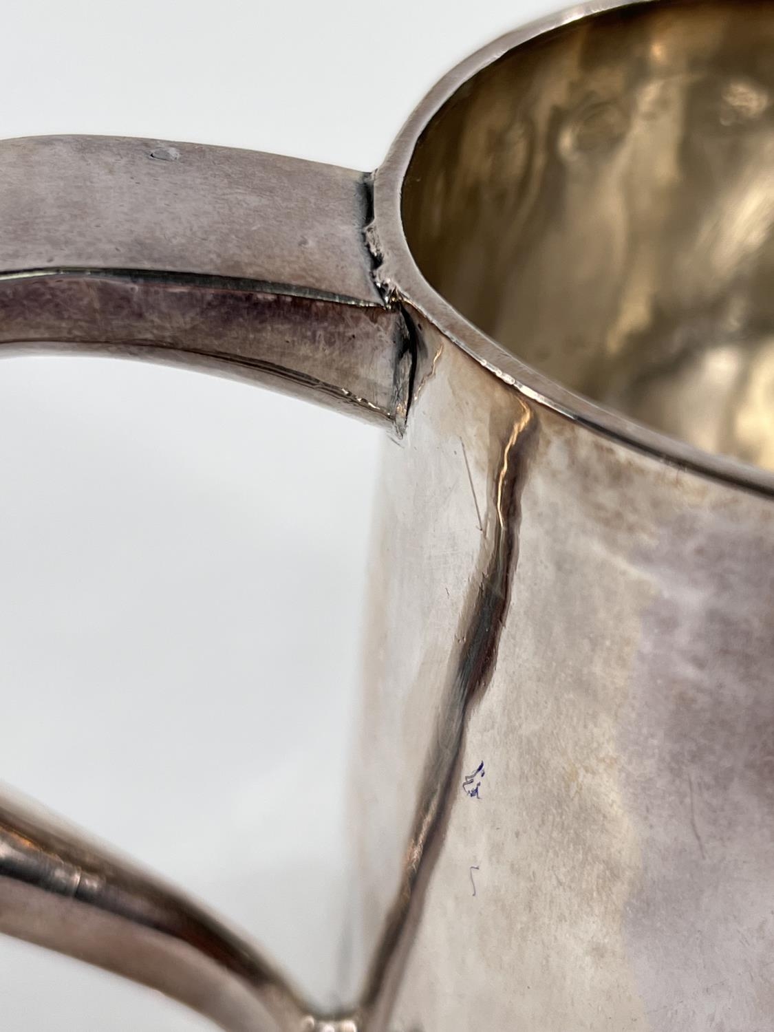 A Charles I hallmarked silver mug of tapering cylindrical form with engraved Coat of Arms, London 1642, the base monogrammed "H A I", and with scratch weight "14-12-0", 10.5oz/335gm, maker R S (some repairs; possibly had lid originally)