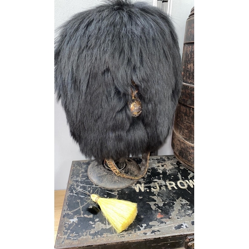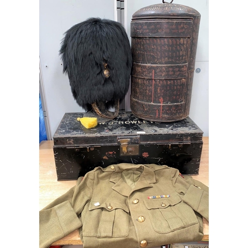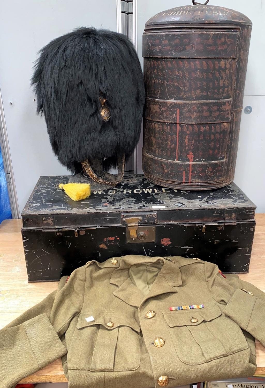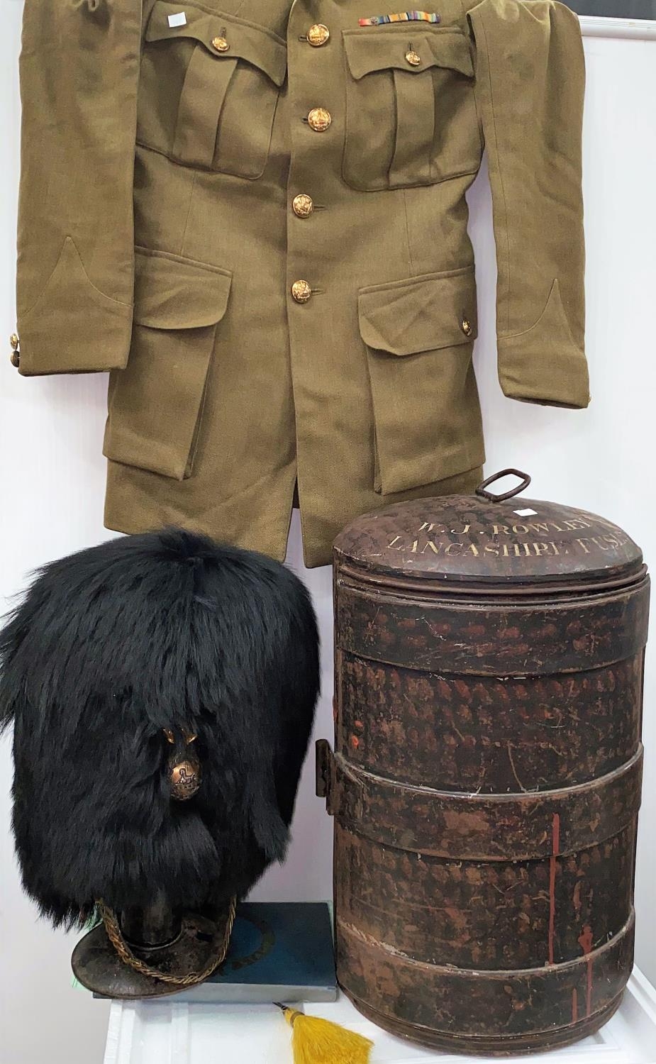 LANCASHIRE FUSILIERS, W J ROWLEY, dress uniform with bearskin, badge and plume, jacket and trousers, further mess dress, contained in original named tin containers